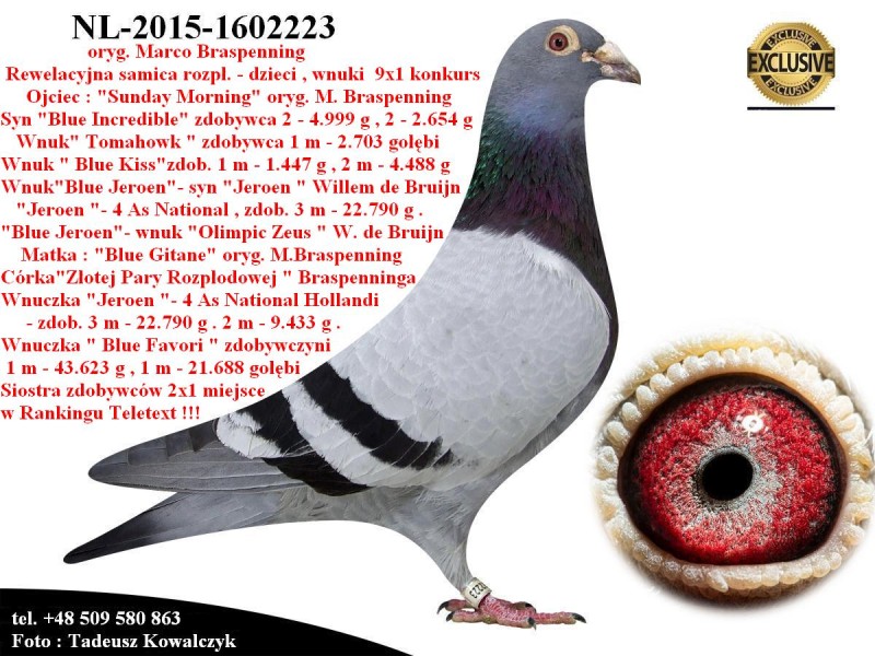 Opis: AUKCJA PROMOCYJNA ROCZNIKA 2025 (Cena obowiązuje wyłącznie na tej aukcji) Profesjonalna hodowla z wieloletnim doświadczeniem, posiadająca w swoim stadzie materiał najwyższej światowej klasy, wywodzący się od takich hodowców jak: Jan Hooymans, Gerard Koopman, Mike Ganus, Tjeerd & Jouke Elzinga, Gino Clicque, Jos Vercammen, Jelle Roziers, Bart Geerinckx, Batenburg – v/d Merwe, Altmiks – Pigeons, Jo & Florian Hendriks, Kornelis Winner Loft – linia „Romario”, W & F Ebben, Bert Braspenning, Dirk van den Bulck, Peter v/d Merwe, Jan van de Pasch, Van Elsacker-Jepsen, Roger Desmet – Matthijs, Arie Dijkstra, Leo Heremans, Pieter Veenstra, Gaby Vandenabeele, Karl-Heinz Wichert, Hardy Kruger, Helmut & Alfons Klaas, Gebr. Janssen. Najwyższej klasy materiał hodowlany – najlepsze linie danych Hodowców