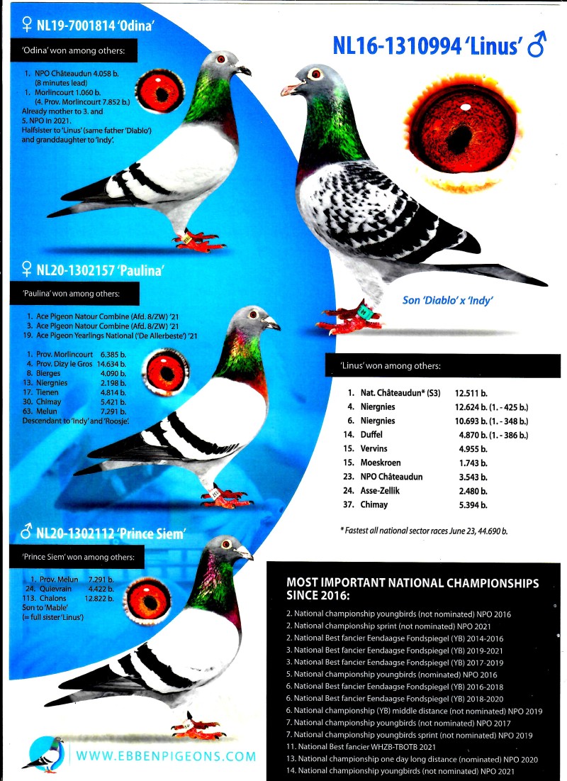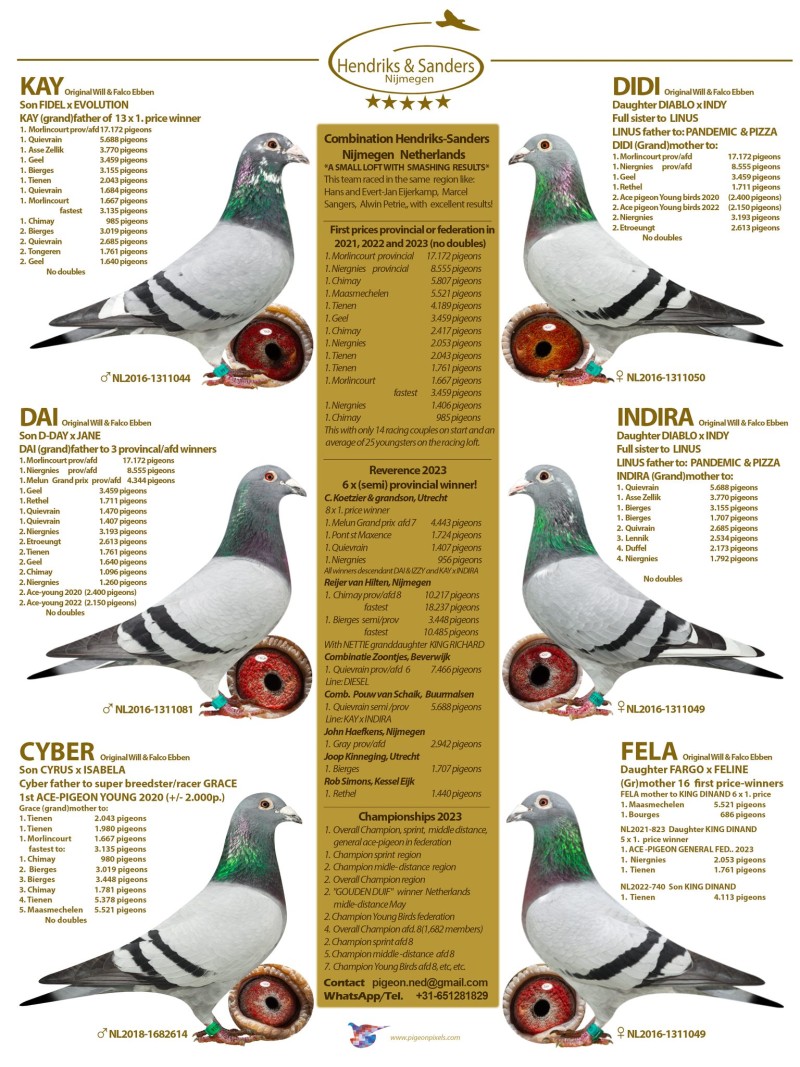 Opis: AUKCJA PROMOCYJNA ROCZNIKA 2025 (Cena obowiązuje wyłącznie na tej aukcji) Profesjonalna hodowla z wieloletnim doświadczeniem, posiadająca w swoim stadzie materiał najwyższej światowej klasy, wywodzący się od takich hodowców jak: Jan Hooymans, Gerard Koopman, Mike Ganus, Tjeerd & Jouke Elzinga, Gino Clicque, Jos Vercammen, Jelle Roziers, Bart Geerinckx, Batenburg – v/d Merwe, Altmiks – Pigeons, Jo & Florian Hendriks, Kornelis Winner Loft – linia „Romario”, W & F Ebben, Bert Braspenning, Dirk van den Bulck, Peter v/d Merwe, Jan van de Pasch, Van Elsacker-Jepsen, Roger Desmet – Matthijs, Arie Dijkstra, Leo Heremans, Pieter Veenstra, Gaby Vandenabeele, Karl-Heinz Wichert, Hardy Kruger, Helmut & Alfons Klaas, Gebr. Janssen. Najwyższej klasy materiał hodowlany – najlepsze linie danych Hodowców