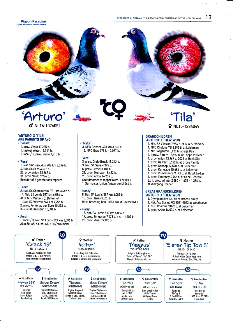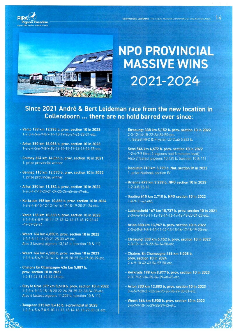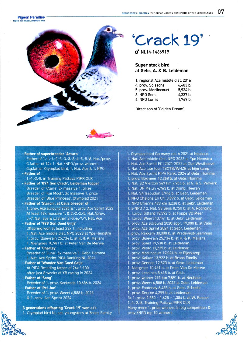Opis: AUKCJA PROMOCYJNA ROCZNIKA 2025 (Cena obowiązuje wyłącznie na tej aukcji) Profesjonalna hodowla z wieloletnim doświadczeniem, posiadająca w swoim stadzie materiał najwyższej światowej klasy, wywodzący się od takich hodowców jak: Jan Hooymans, Gerard Koopman, Mike Ganus, Tjeerd & Jouke Elzinga, Gino Clicque, Jos Vercammen, Jelle Roziers, Bart Geerinckx, Batenburg – v/d Merwe, Altmiks – Pigeons, Jo & Florian Hendriks, Kornelis Winner Loft – linia „Romario”, W & F Ebben, Bert Braspenning, Dirk van den Bulck, Peter v/d Merwe, Jan van de Pasch, Van Elsacker-Jepsen, Roger Desmet – Matthijs, Arie Dijkstra, Leo Heremans, Pieter Veenstra, Gaby Vandenabeele, Karl-Heinz Wichert, Hardy Kruger, Helmut & Alfons Klaas, Gebr. Janssen. Najwyższej klasy materiał hodowlany – najlepsze linie danych Hodowców