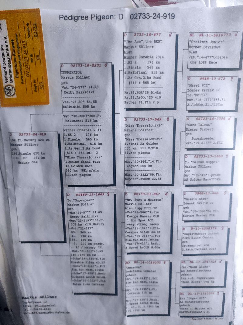 Opis: Witam na sprzedaż młody z połączenia gołębi Marcina Kapinosa + samiczka od Markusa Sollnera, uczestniczka WG Mazury, która jest wnuczką jego słynnego gołębia The Ace zwycięzcy WG Corabia 2014 rok. Gołębie po tej samiczce przyczyniły się do zdobycia 2 miejsca w oddziale Szamotuły oraz 3 miejsca w Okręgu Poznań w lotach gołębi młodych. Zapraszam do kontaktu telefonicznego. Istnieje możliwość wysyłki, odbioru osobistego bądź przetrzymania do wystawy ogólnopolskiej.