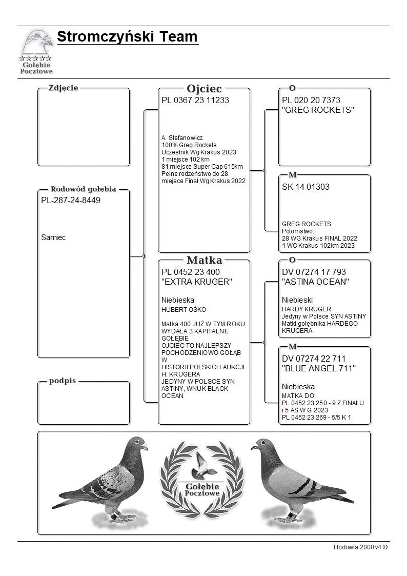 Opis: Witam na sprzedaż późny młody z 24 roku wyhodowany do rozpłodu. Sprzedaję z powodu braku miejsca w rozplodzie. Gołąb z fajnego połączenia uczestnika wg Krakus który zajął 1 miejsce w locie Sośnicowice + samiczka od Huberta Ośko z gołębi Hardy Kruger. Dzieci z tych gołębi w 25 roku pomogły w zdobyciu 3 miejsca w Okręgu Poznań w lotach gołębi młodych. Zapraszam do kontaktu telefonicznego. Istnieje możliwość wysyłki, odbioru osobistego bądź przetrzymania do wystawy ogólnopolskiej.