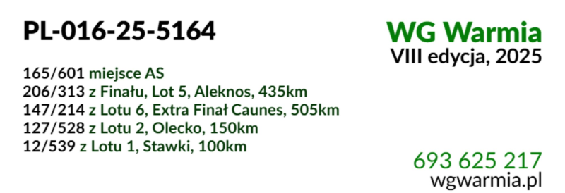 Opis: Uczestnik WG Warmia 2025, sezon VIII. Loty z kierunku północny wschód, Litwa. 206 z Finału, 165 AS, 147 z Extra Finału. Szczegóły pochodzenia w rodowodzie.