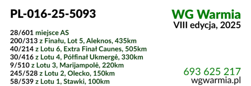 Opis: Uczestnik WG Warmia 2025, sezon VIII. Loty z kierunku północny wschód, Litwa. 200 z Finału, 28 AS, 40 z Extra Finału. Szczegóły pochodzenia w rodowodzie.