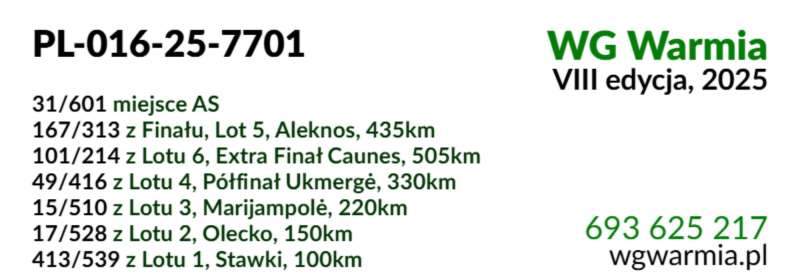 Opis: Uczestnik WG Warmia 2025, sezon VIII. Loty z kierunku północny wschód, Litwa. 167 z Finału, 31 AS, 101 z Extra Finału. Szczegóły pochodzenia w rodowodzie.