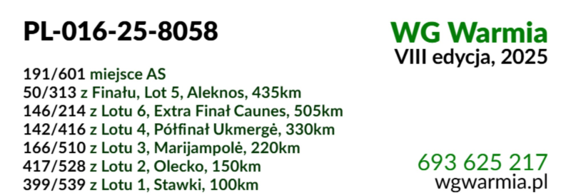 Opis: Uczestnik WG Warmia 2025, sezon VIII. Loty z kierunku północny wschód, Litwa. 50 z Finału, 191 AS, 146 z Extra Finału. Szczegóły pochodzenia w rodowodzie.
