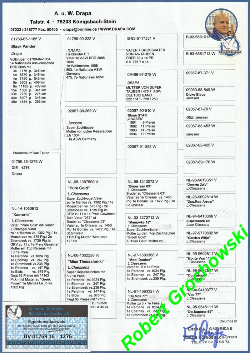 Opis: Oryginalny gołąb z hodowli Roberta Grochowskiego. Szczegóły pochodzenia w rodowodzie. Gołąb to prawdopodobnie SAMICA. Więcej informacji pod numerem 600133330 Przy opcji "KUP TERAZ" transport GRATIS (do najbliższego miasta od kupującego).