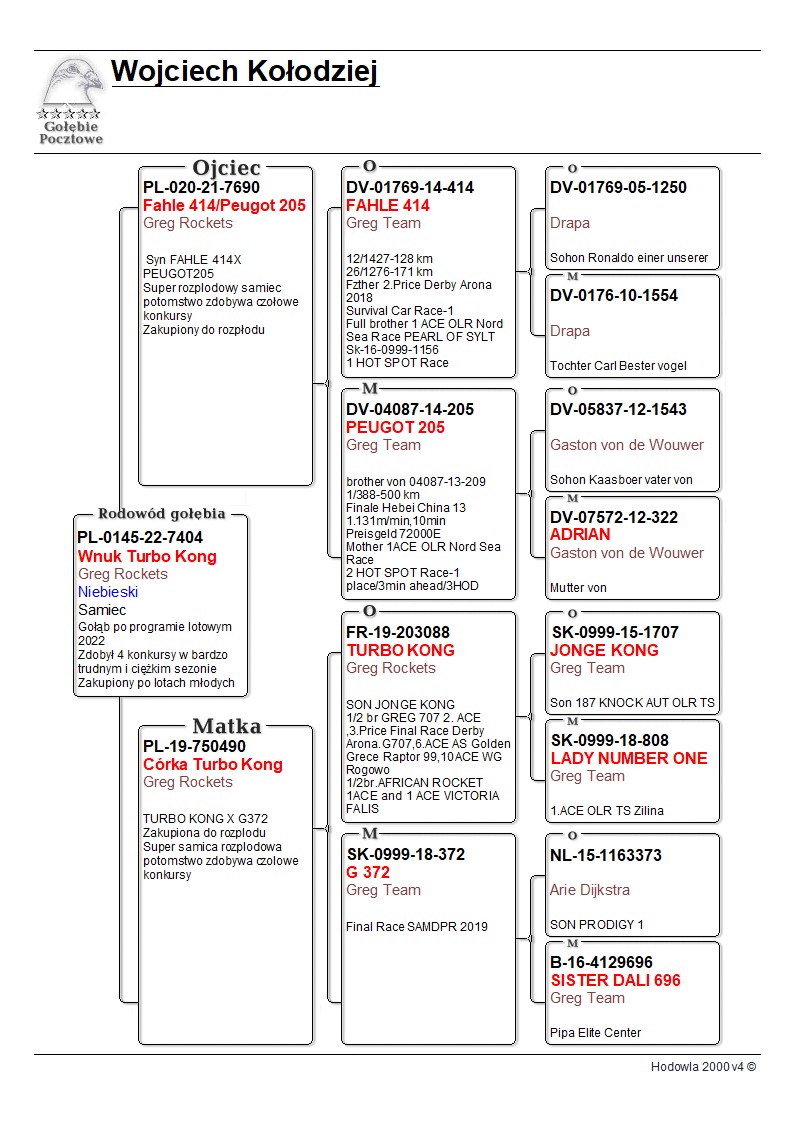 Opis: Oryginalny gołąb z hodowli Wojciecha Kołodzieja. Szczegóły pochodzenia w rodowodzie. Więcej informacji pod nr tel.: 608077136 **Wysyłka do 6 sztuk w jednej paczce za 150zł, przedpłata na konto GRATIS DV-01181-14-224 to samica