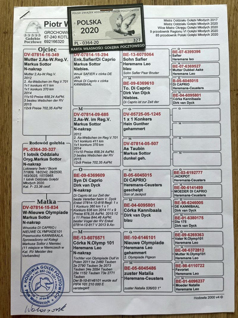 Opis: Oryginalny gołąb z hodowli Piotra Walaszczyka. 1 lotnik Oddziału 5 wkł / 5konk. Więcej informacji w rodowodzie i pod nr tel. 530131812 **wysyłka kurierem ok 150 zł