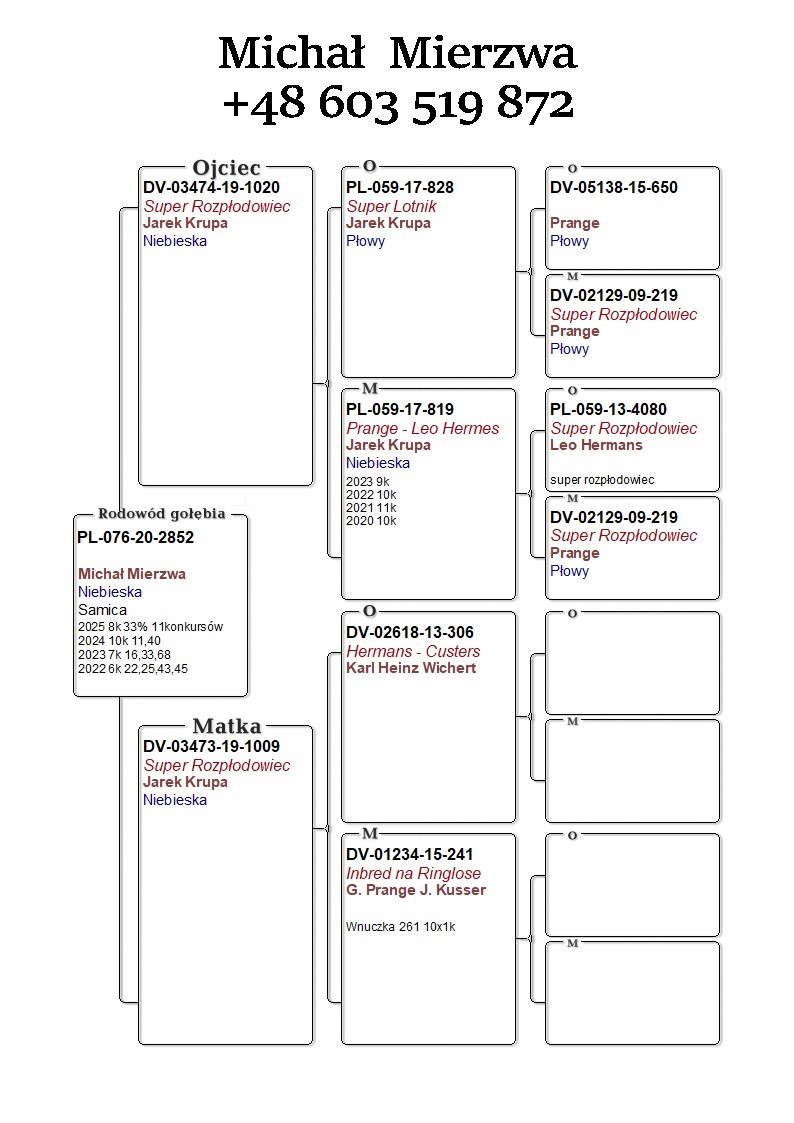 Opis: Oryginalny gołąb z hodowli Michał Mierzwa. Szczegóły pochodzenia w rodowodzie. Więcej informacji pod nr tel.: 603 519 872