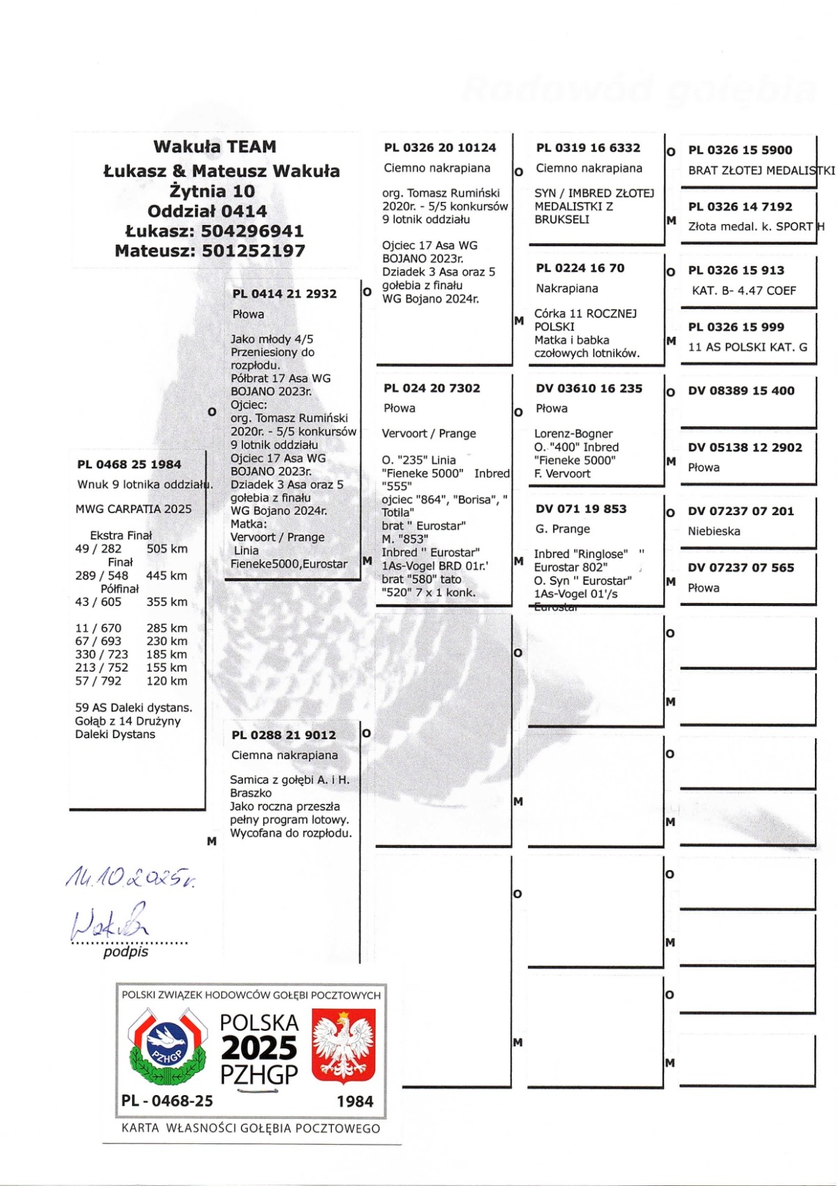 | Lot | Data | Dystans [km] | Ilość gołębi | Pozycja | Prędkość [m/min] |