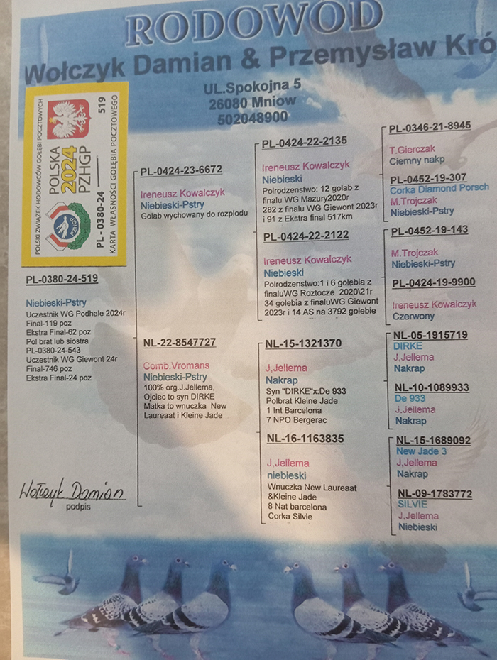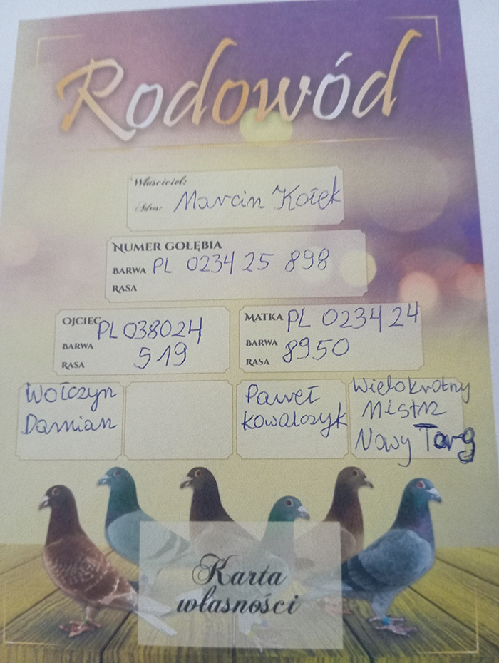 | Lot | Data | Dystans [km] | Ilość gołębi | Pozycja | Prędkość [m/min] |