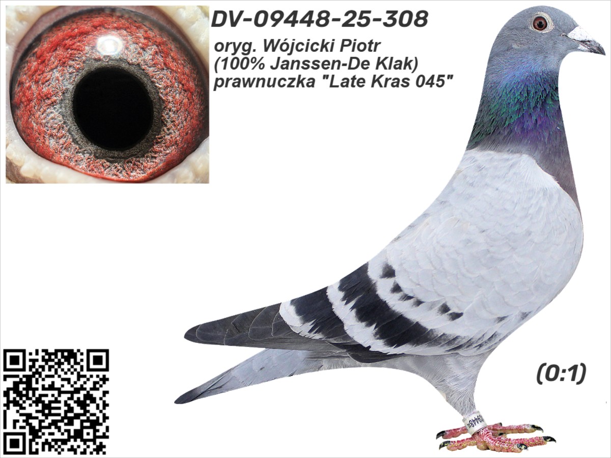 oryg. Wójcicki Piotr (100% Janssen-De Klak), prawnuczka "Late Kras 045" Szczegóły pochodzenia w rodowodzie i załączonych materiałach. Więcej informacji o gołębiach i transporcie pod nr tel.: +48 505 674 678.