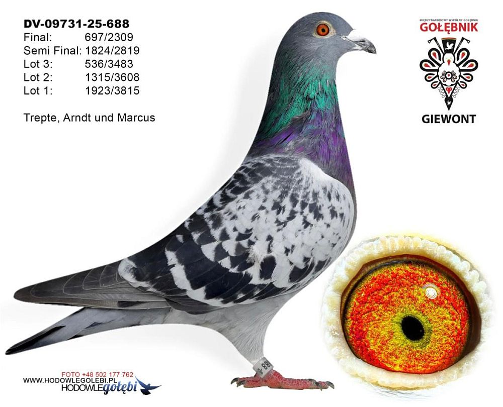 oryg. Trepte Arndt & Marcus, uczestnik MWG Giewont 2025 Szczegóły pochodzenia w rodowodzie i załączonych materiałach. Więcej informacji o gołębiu pod nr tel.: 602 106 909.
