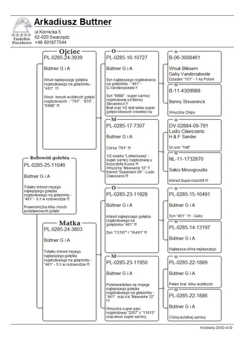 PL-0285-25-11046 Büttner G i A INBRED 461 JEDNEGO Z NAJLEPSZYCH GOŁĘBI ROZPŁODOWYCH POLSKI, POKREWIEŃSTWO NA MEEUWKE 12