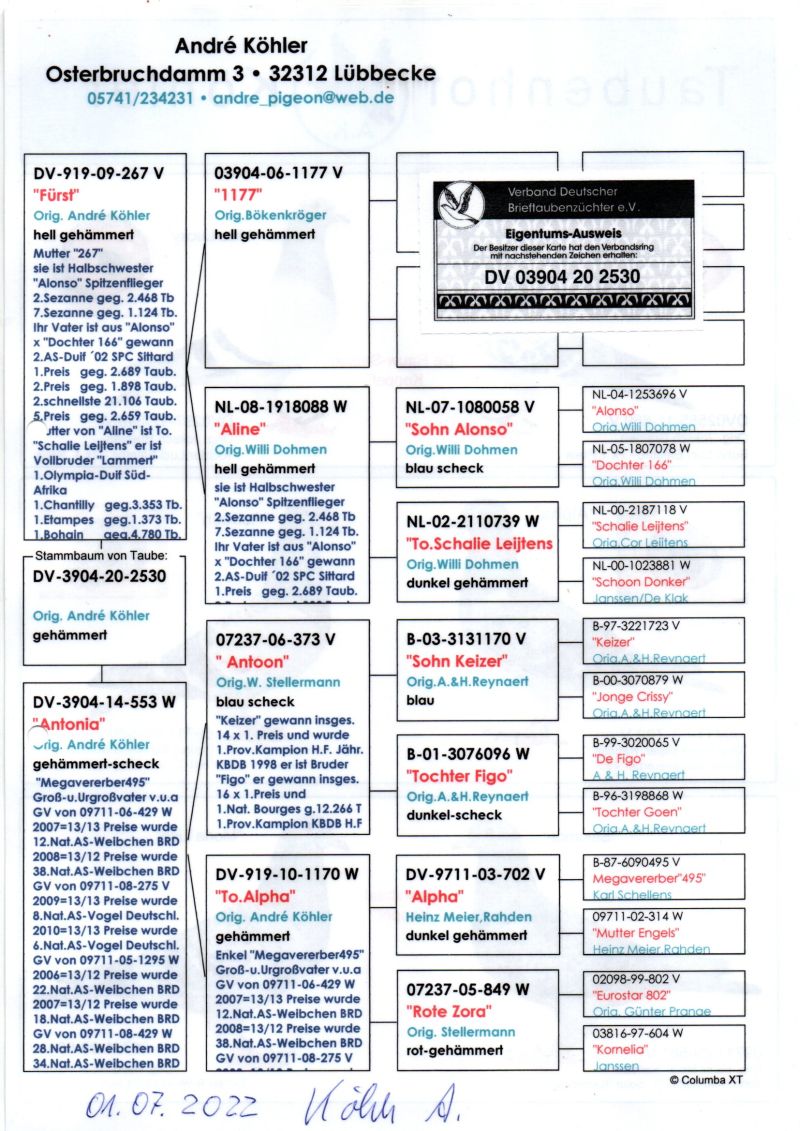 Opis: Oryginalny gołąb z hodowli Andre Kohler. Szczegóły pochodzenia w rodowodzie. Więcej informacji pod nr tel.: 608 077 136 **Wysyłka do 6 sztuk w jednej paczce za 150zł, przedpłata na konto.