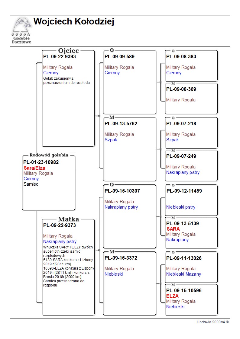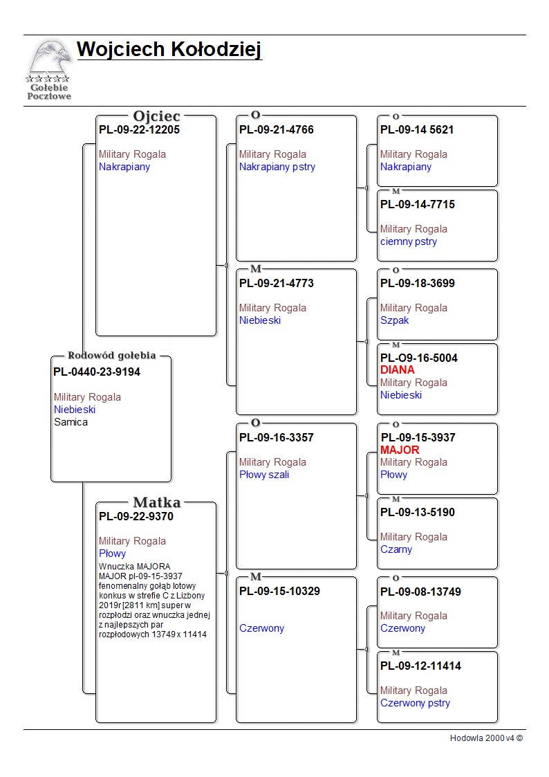 Opis: Oryginalny gołąb z hodowli Wojciecha Kołodzieja. Szczegóły pochodzenia w rodowodzie. Więcej informacji pod nr tel.: 608 077 136 **Wysyłka do 6 sztuk w jednej paczce za 150zł, przedpłata na konto.