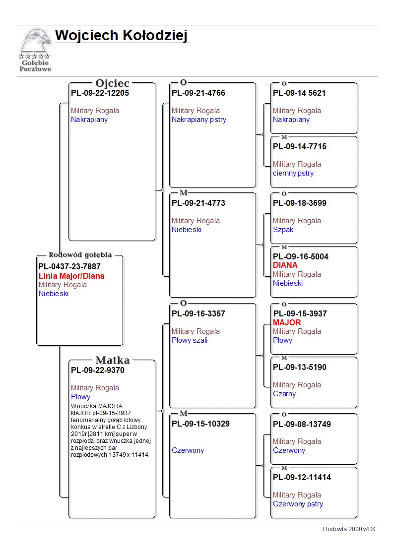 Opis: Oryginalny gołąb z hodowli Wojciecha Kołodzieja. Szczegóły pochodzenia w rodowodzie. Więcej informacji pod nr tel.: 608 077 136 **Wysyłka do 6 sztuk w jednej paczce za 150zł, przedpłata na konto.