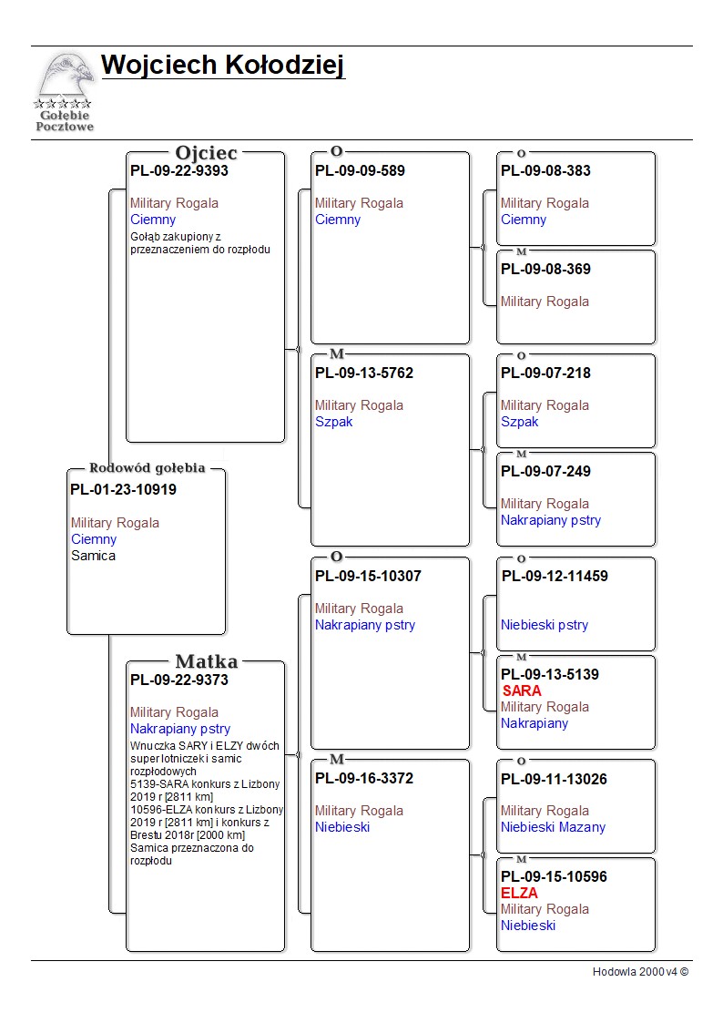 Opis: Oryginalny gołąb z hodowli Wojciecha Kołodzieja. Szczegóły pochodzenia w rodowodzie. Więcej informacji pod nr tel.: 608 077 136 **Wysyłka do 6 sztuk w jednej paczce za 150zł, przedpłata na konto.