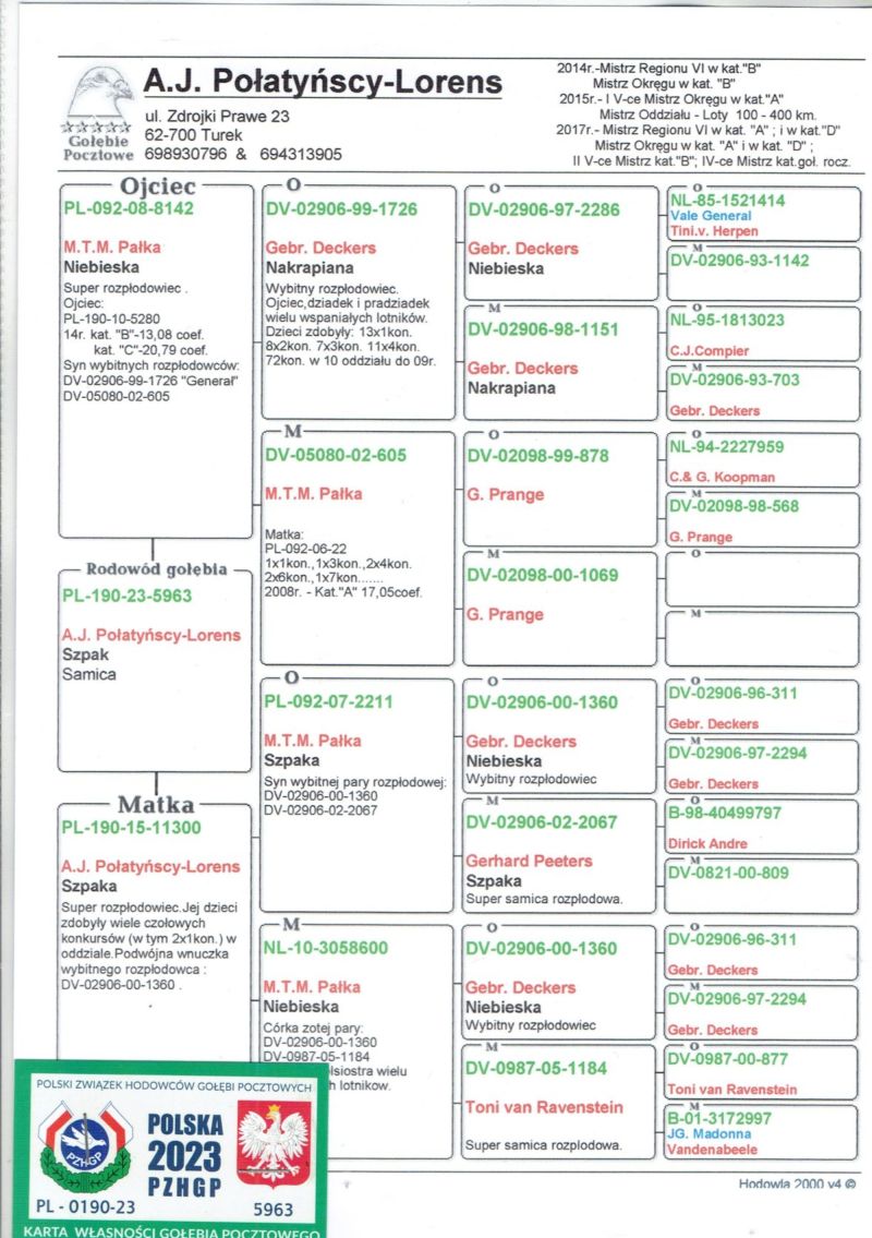PL-0190-23-5963 - oryg. Połatyńscy - Lorens z gołebi 100% M.T.M Pałka