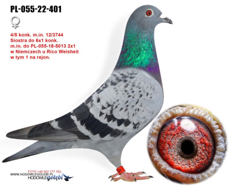 Opis: Samiczka super budowy zdrowa płodna, lotowana 4/5 konkursów m.in 12/3744. Siostra do 6x1 konkurs. Więcej informacji w rodowodzie
