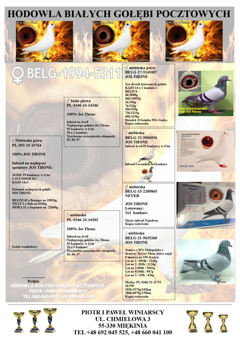 Opis: Kup teraz 300. Dzień dobry koleżanki i koledzy. Do sprzedania młode gołębie pocztowe 100% Jos Thoné z linii najszybszego gołębia Avril od Jos Thoné. Krzyżówki są idealne do lotu. W 2024 z krzyżówki moich białych oraz Josow, młody został 10 lotnikiem na WG. Kolejny młody zdobył 5/6 konkursów w tym zlotu dodatkowego był 7 na rejon. Gołębie są sprzedawane z powodu rezygnacji z lotowania gołębiami w PZHGP. Pełne pochodzenie i karta do kazdego gołębia. Zachęcam do zadawania pytań. Jestem dostępny dla Państwa pod numerem telefonu 692045525. Do usłyszenia i zobaczenia. Do Myszkowa i Grudziądza wysyłka gratis. Proszę o kontakt przed zalicytowaniem w celu ustalenia płci i warunków transportu.
