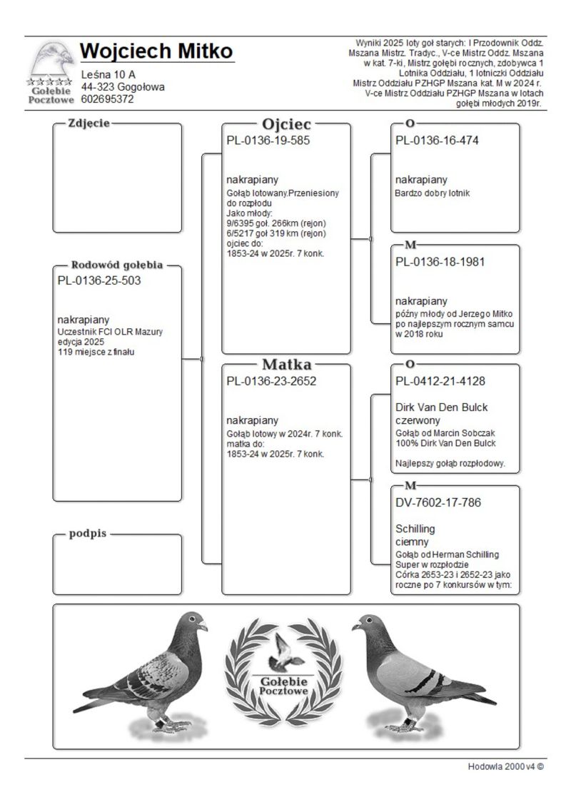 Szczegóły pochodzenia w rodowodzie. Pełne wyniki gołębia w sezonie lotowym na stronie: