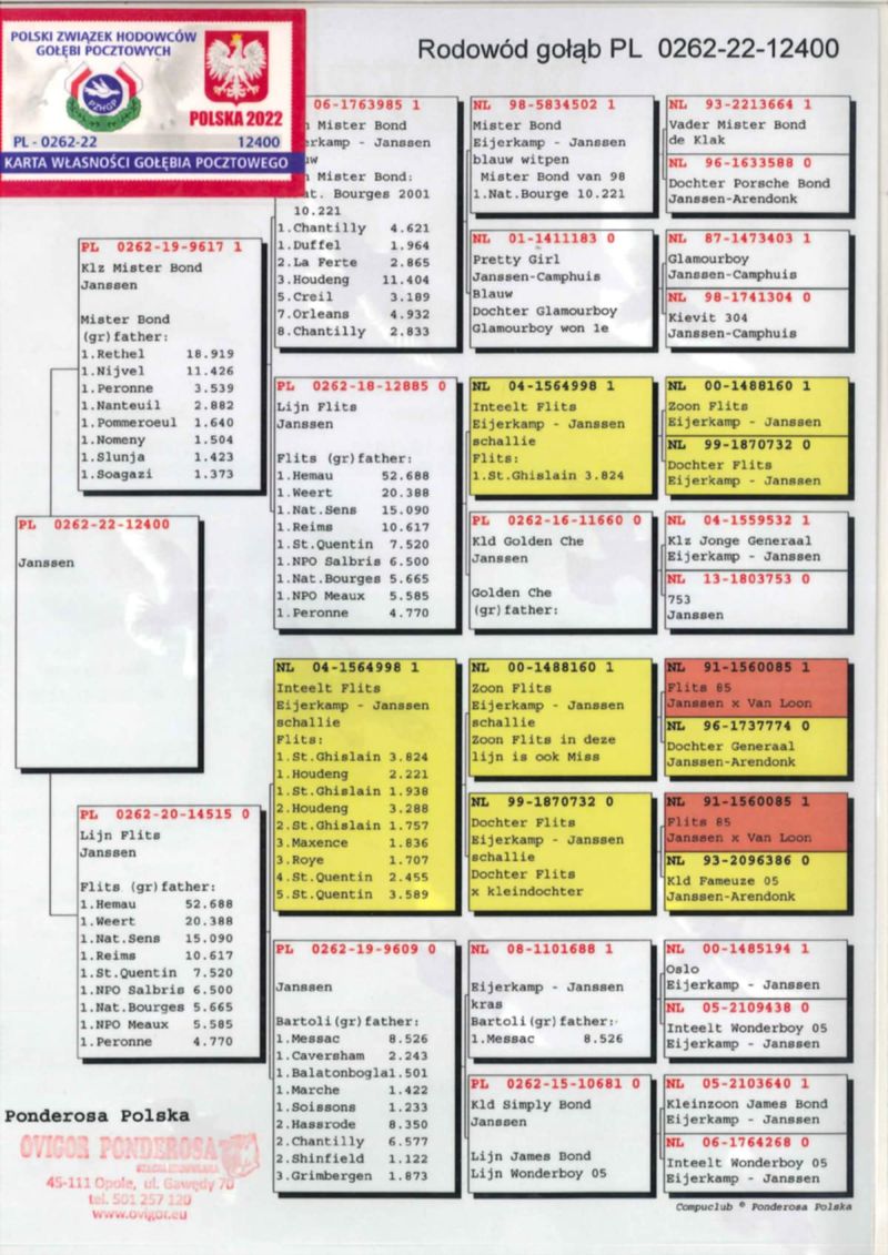 Opis: Oryginalny gołąb z hodowli Ovigor Panderosa z lijn Flits Eijerkamp- Janssen. Pięknej budowy samica o dużej wielkości. Szczegóły pochodzenia o gołębiu w rodowodzie. Więcej info o gołębiu pod nr tel 697-181-791. Transport gołębia pokrywa kupujący.