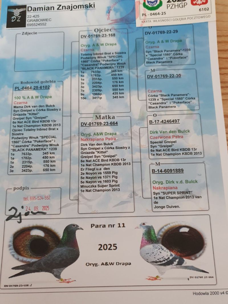 PL-0464-25-6102 0ryg. A&W Drapa Dirk Van den Bulck Syn "Greinpel" x córka "Super Sprint 873" x Podwójny Wnuk "Black Pana