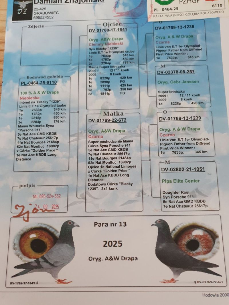Opis: Oryginalny gołąb z hodowli Damian Znajomskiego . Wychowany w boksie indywidualnym z możliwością zbadania pokrewieństwa. Zaszczepiony Columba PHA. Możliwy transport POLSKA NIEMCY BELGIA HOLANDIA AUSTRIA ANGLIA. Tylko opcja KUP TERAZ. Tel. 695-524-552