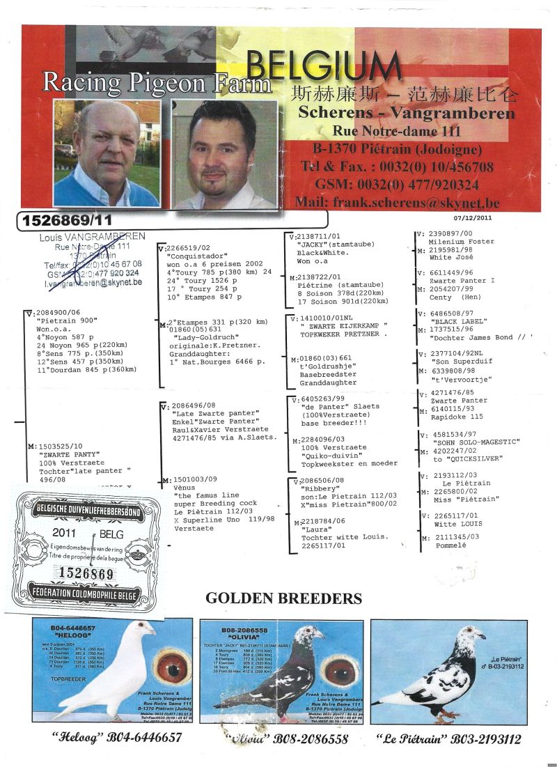 Opis: Oryginalny legendarny samiec Scherens Vangramberen. Gołąb sprowadzony bezpośrednio od Louisa Vangramberena za Jego życia. Jest to syn "Pietrain900" . Ptak mimo wieku płodny w tym sezonie w celi indywidualnej wydał 3 młode. Jest to jedyny oryginalny ptak z tego rocznika przebywający w Polsce oraz jeden z 3 na całą Europę. Gołąb unikatowy, bardzo proszę o licytację tylko prawdziwych miłośników i hodowców którzy będą w stanie zapewnić odpowiednie warunki . Ptak zdrowy, szczepiony. Transport gołębia gratis.