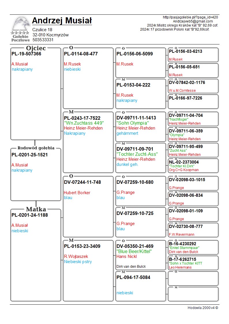 Opis: Oryginalny gołąb z hodowli Andrzeja Musiała. Szczegóły pochodzenia w rodowodzie. Więcej informacji pod nr tel.: 503 533 331