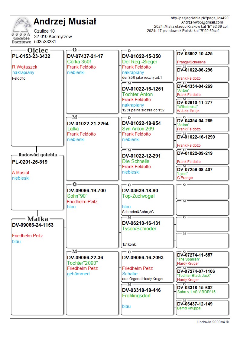 Opis: Oryginalny gołąb z hodowli Andrzeja Musiała. Szczegóły pochodzenia w rodowodzie. Więcej informacji pod nr tel.: 503 533 331