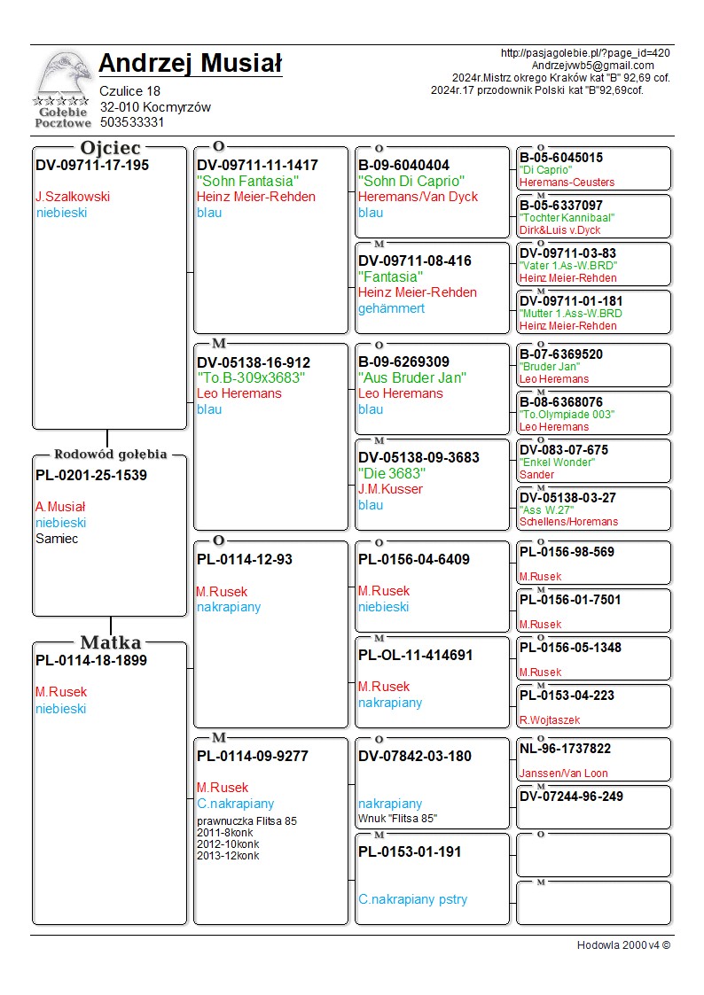 Opis: Oryginalny gołąb z hodowli Andrzeja Musiała. Szczegóły pochodzenia w rodowodzie. Więcej informacji pod nr tel.: 503 533 331