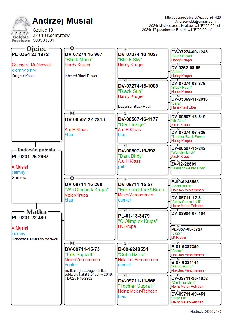 Opis: Oryginalny gołąb z hodowli Andrzeja Musiała. Szczegóły pochodzenia w rodowodzie. Więcej informacji pod nr tel.: 503 533 331