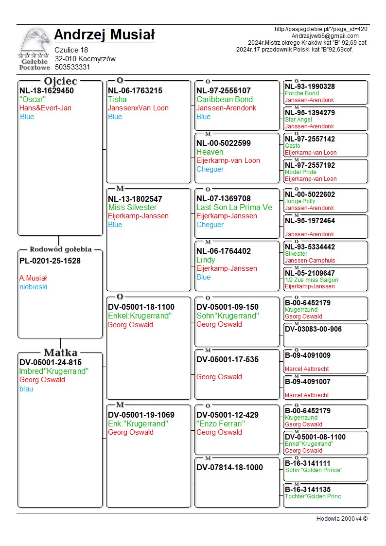 Opis: Oryginalny gołąb z hodowli Andrzeja Musiała. Szczegóły pochodzenia w rodowodzie. Więcej informacji pod nr tel.: 503 533 331