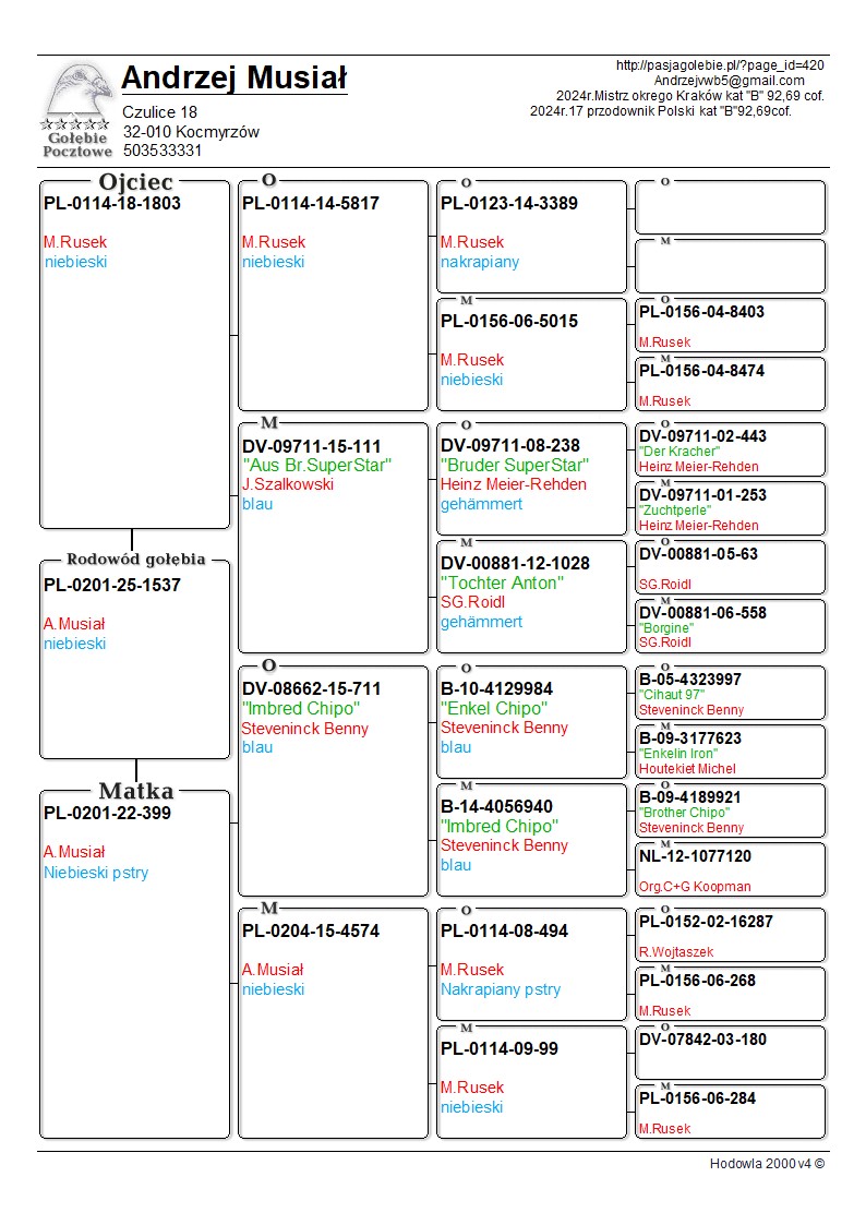 Opis: Oryginalny gołąb z hodowli Andrzeja Musiała. Szczegóły pochodzenia w rodowodzie. Więcej informacji pod nr tel.: 503 533 331