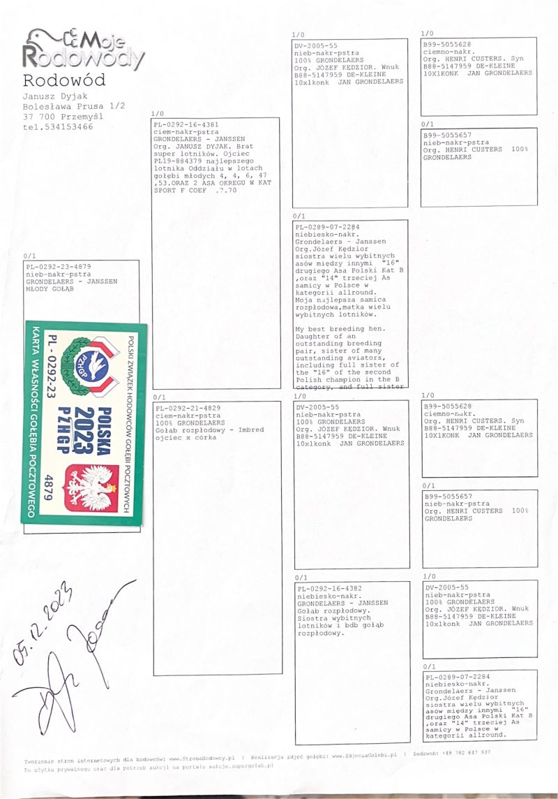 Opis: Oryginalny gołąb z hodowli Janusz Dyjak - Grondelaers / Janssen. Możliwy transport kurierem. Wysyłka po dokonaniu wpłaty na konto. Więcej informacji w rodowodzie oraz pod numerem telefonu:792 362 304