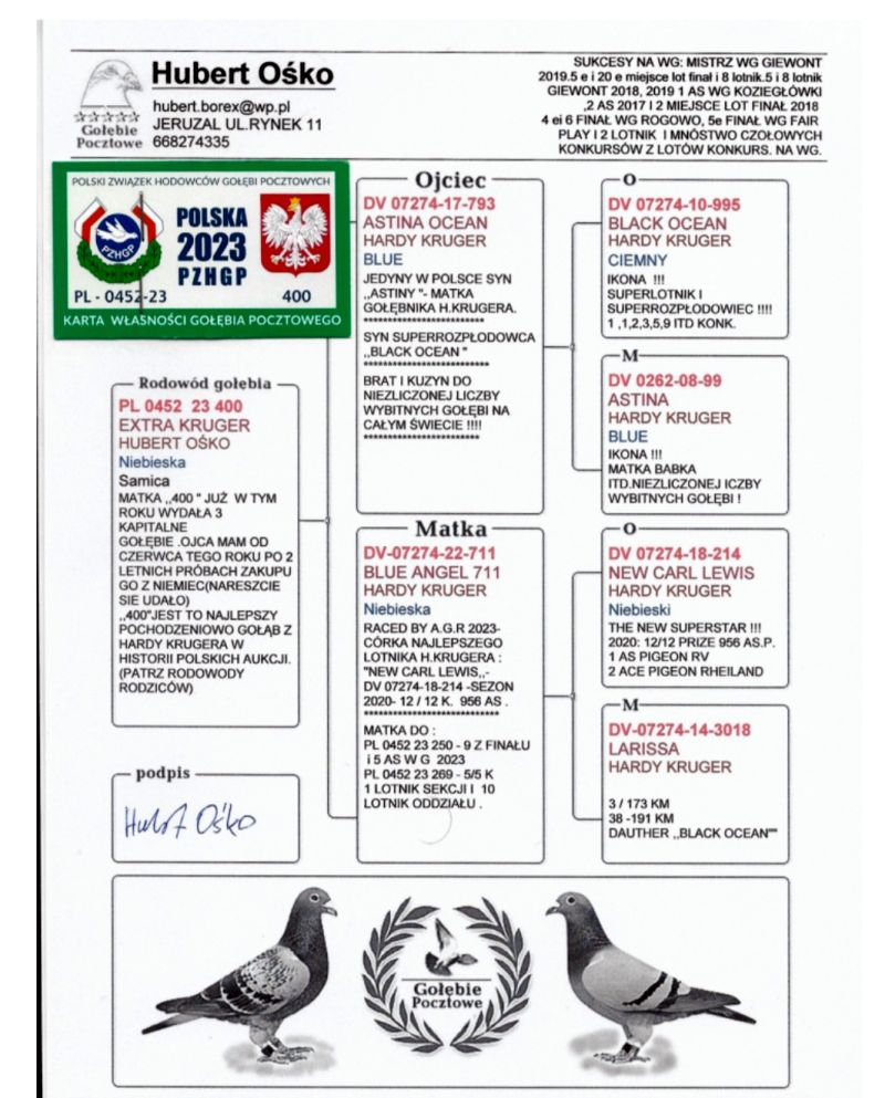 Opis: Witam na sprzedaż późny młody z 24 roku wyhodowany do rozpłodu. Sprzedaję z powodu braku miejsca w rozplodzie. Gołąb z fajnego połączenia uczestnika wg Krakus który zajął 1 miejsce w locie Sośnicowice + samiczka od Huberta Ośko z gołębi Hardy Kruger. Dzieci z tych gołębi w 25 roku pomogły w zdobyciu 3 miejsca w Okręgu Poznań w lotach gołębi młodych. Zapraszam do kontaktu telefonicznego. Istnieje możliwość wysyłki, odbioru osobistego bądź przetrzymania do wystawy ogólnopolskiej.