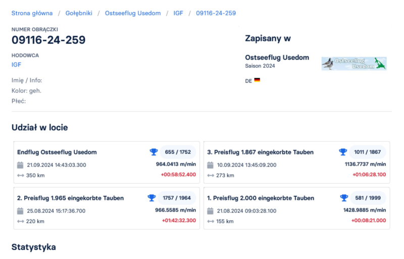 Opis: Wiecej informacji w rodowodzie oraz pod nr telefonu 663602297 Grzegorz. TRANSPORT GRATIS tylko i wyłącznie po wpłacie na konto !!! , płatność przy odbiorze koszt 200 zł dostarczenia paczki. Gołąb zostanie dostarczony w jak najszybszym terminie nie dluższym niż 14 dni po zakończonej aukcji.