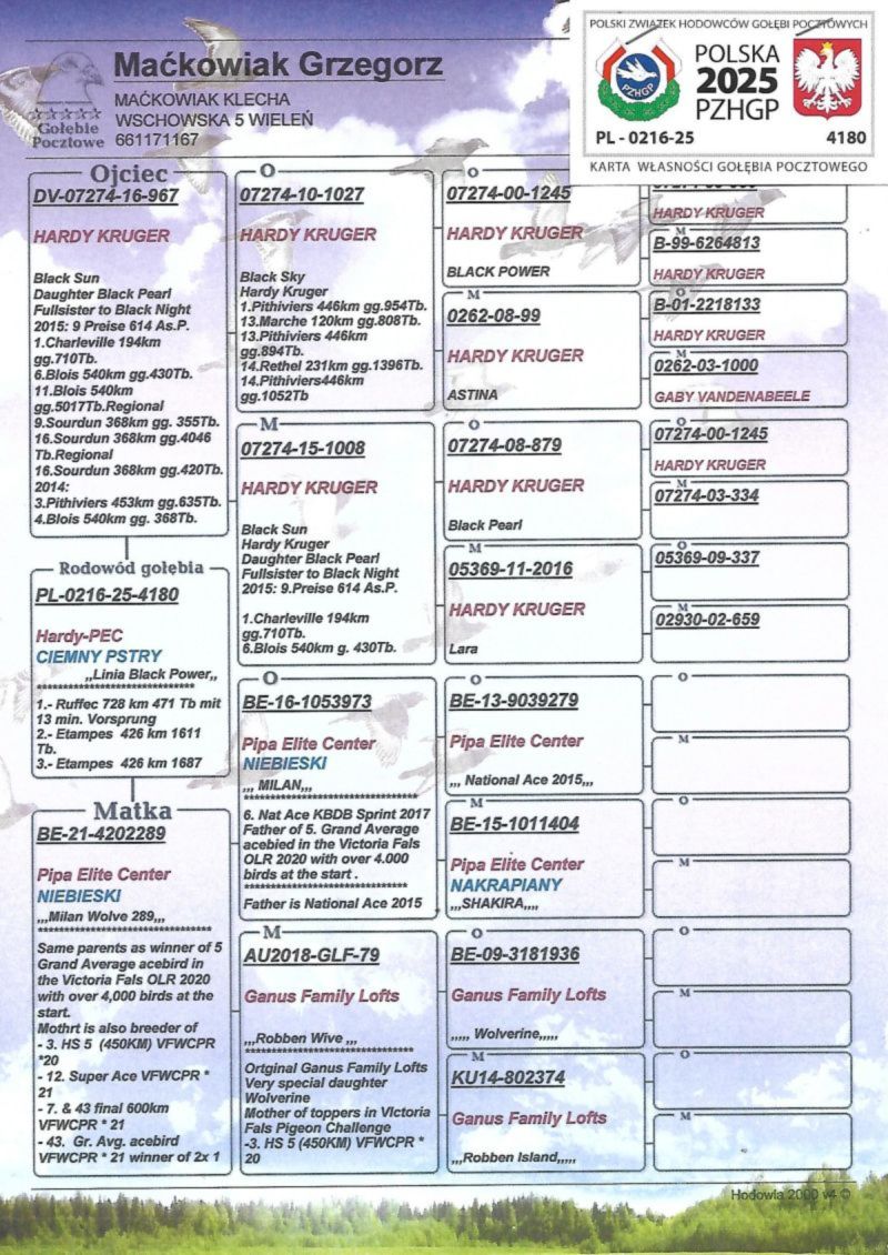PL-0216-25-4180 Hardy Kroger linia Blac Power, Black Pearl x corka Milana 6 lotnik Belgii