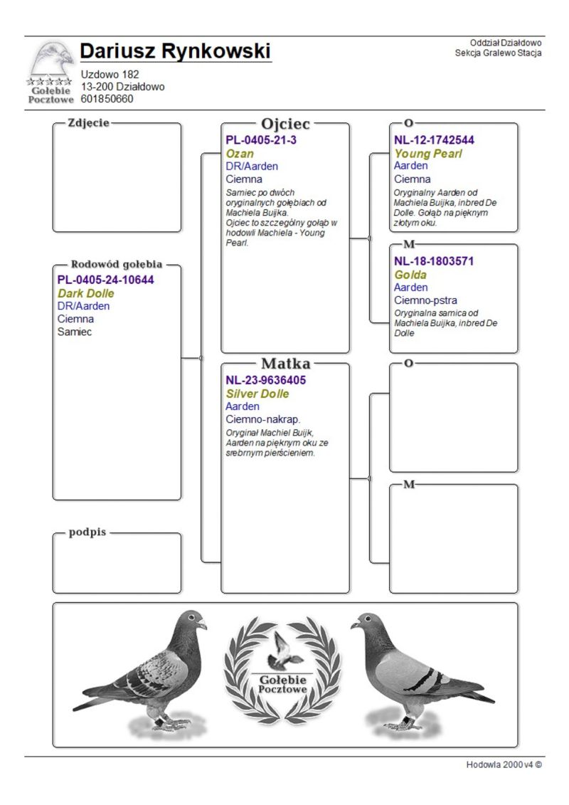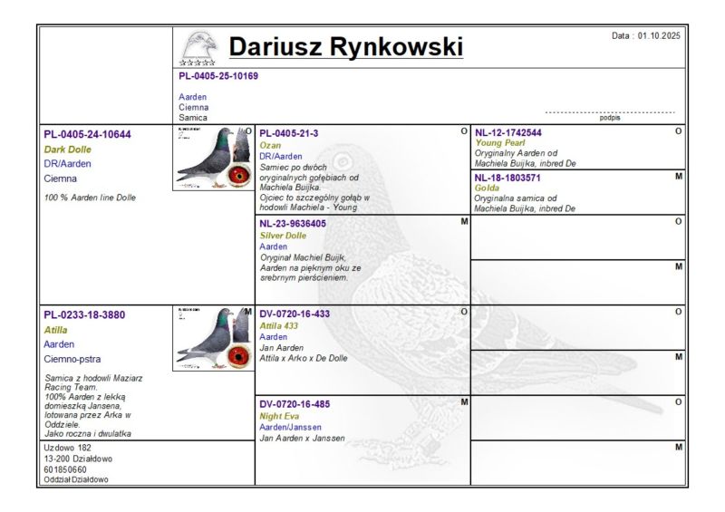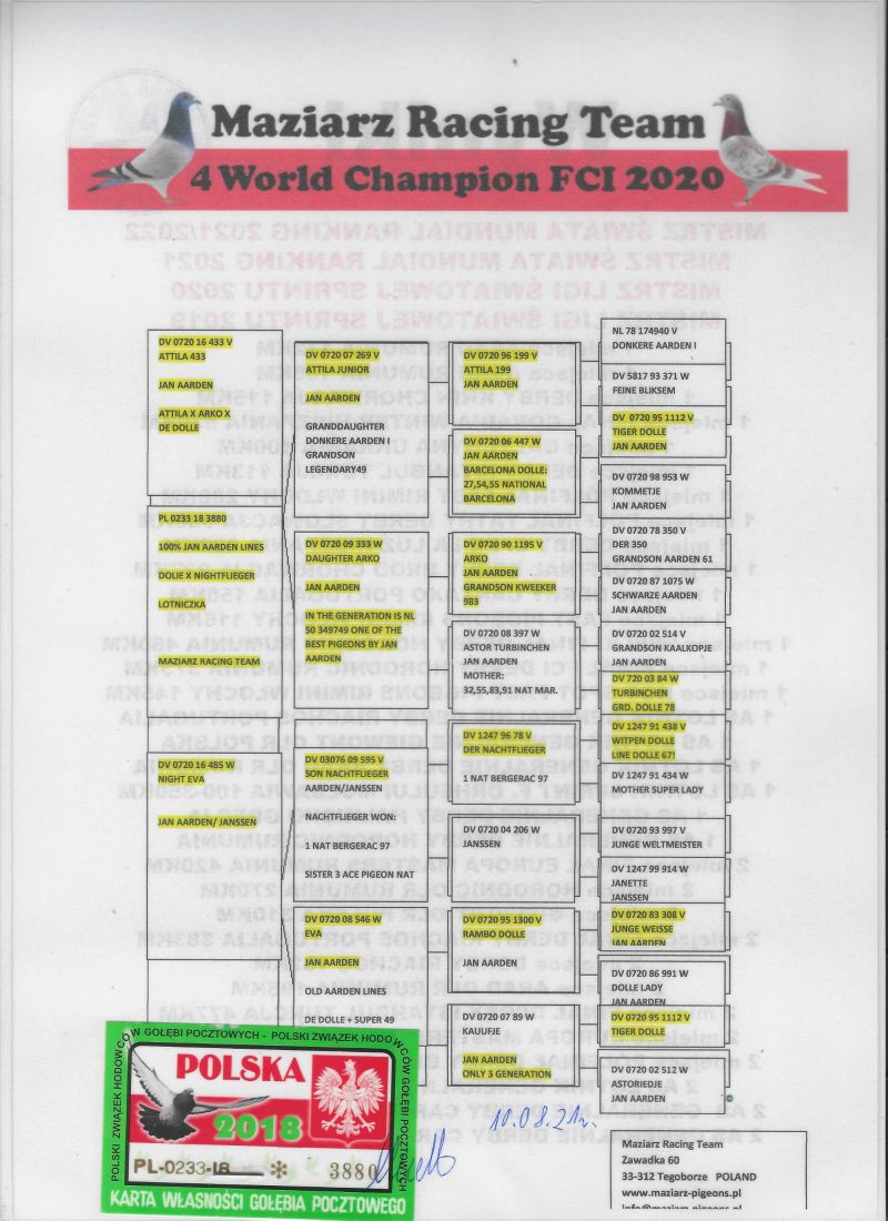 Opis: Młody Aarden ojciec to 100% Machiela Buijk z linii De Dolle, mama oryginalna Aardenka z hodowli Maziarz Racing Team, 100% Aarden z lekką domieszką Jansena,