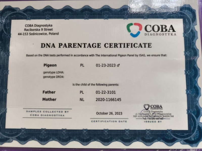 Opis: Szczegóły pochodzenia oferowanego gołębia zostały przedstawione na załączonym rodowodzie,