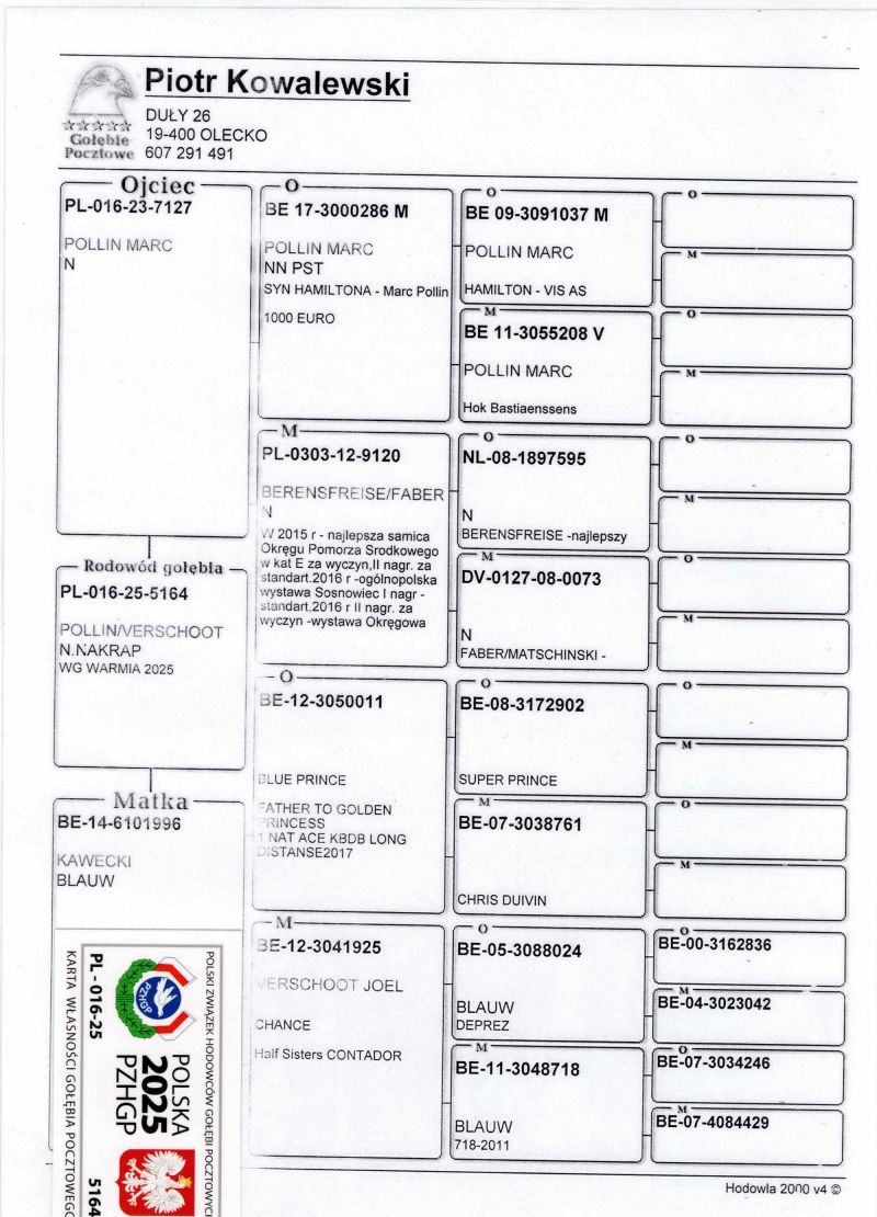 Opis: Uczestnik WG Warmia 2025, sezon VIII. Loty z kierunku północny wschód, Litwa. 206 z Finału, 165 AS, 147 z Extra Finału. Szczegóły pochodzenia w rodowodzie.