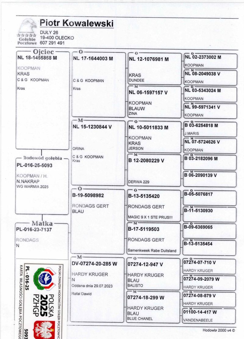 Opis: Uczestnik WG Warmia 2025, sezon VIII. Loty z kierunku północny wschód, Litwa. 200 z Finału, 28 AS, 40 z Extra Finału. Szczegóły pochodzenia w rodowodzie.