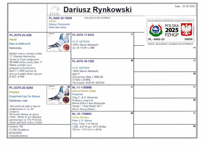 Opis: Uczestnik WG Warmia 2025, sezon VIII. Loty z kierunku północny wschód, Litwa. 185 z Finału, 200 AS, 89 z Extra Finału. Szczegóły pochodzenia w rodowodzie.