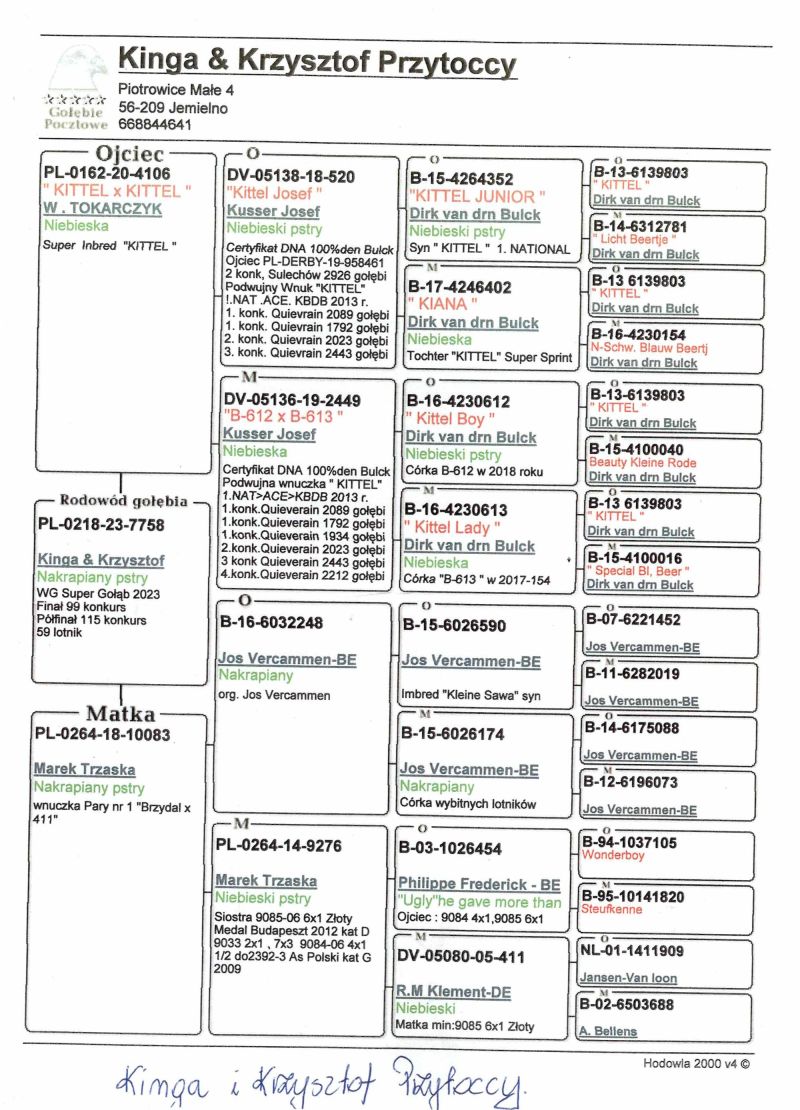 Opis: Uczestnik WG Warmia 2025, sezon VIII. Loty z kierunku północny wschód, Litwa. 180 z Finału, 186 AS, 145 z Extra Finału. Szczegóły pochodzenia w rodowodzie.