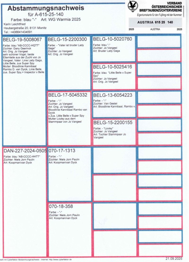 Opis: Uczestnik WG Warmia 2025, sezon VIII. Loty z kierunku północny wschód, Litwa. 173 z Finału, 205 AS, 79 z Extra Finału. Szczegóły pochodzenia w rodowodzie.