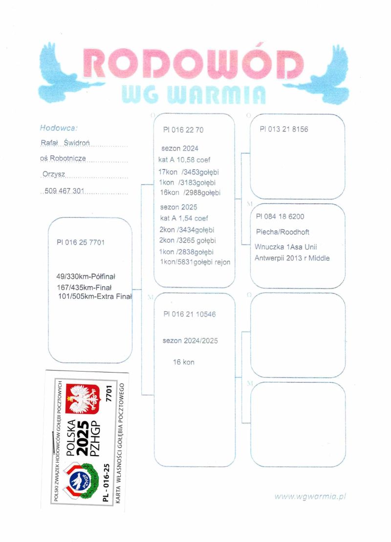 Opis: Uczestnik WG Warmia 2025, sezon VIII. Loty z kierunku północny wschód, Litwa. 167 z Finału, 31 AS, 101 z Extra Finału. Szczegóły pochodzenia w rodowodzie.
