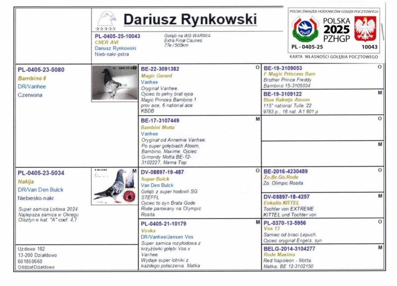 Opis: Uczestnik WG Warmia 2025, sezon VIII. Loty z kierunku północny wschód, Litwa. 134 z Finału, 108 AS, 77 z Extra Finału. Szczegóły pochodzenia w rodowodzie.