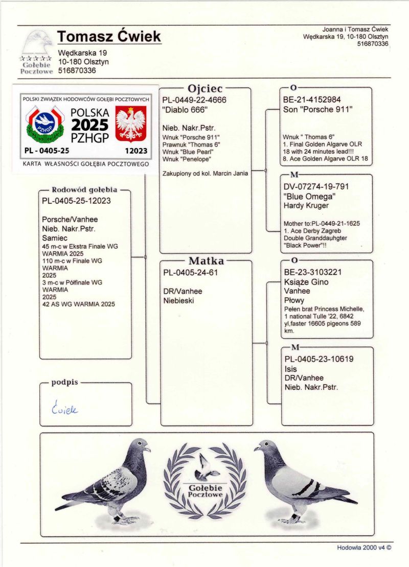 Opis: Uczestnik WG Warmia 2025, sezon VIII. Loty z kierunku północny wschód, Litwa. 110 z Finału, 42 AS, 45 z Extra Finału. Szczegóły pochodzenia w rodowodzie.